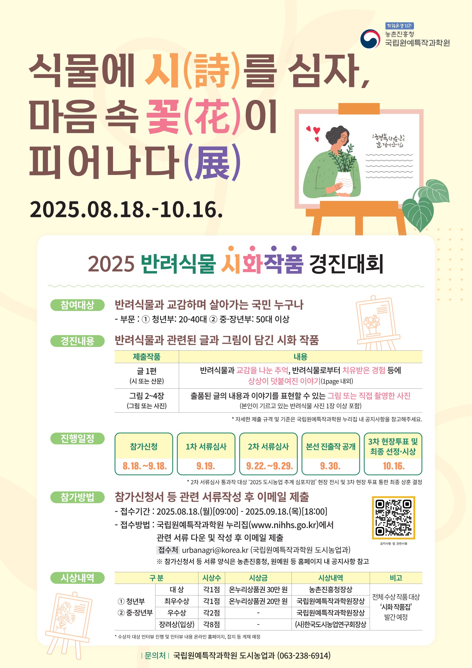 농촌진흥청(청장 이승돈) 국립원예특작과학원이 ‘식물에 시(詩)를 심자, 마음속 꽃(花)이 피어나다’란 주제로 여는 반려식물 시화 작품 경진대회 출품작을 8월 18일부터 9월 18일까지 접수한다고 밝혔다.